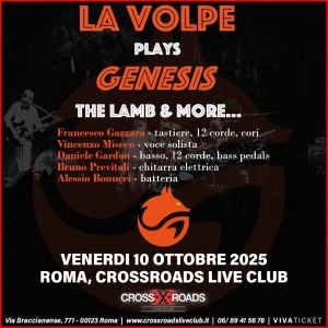 LA VOLPE is a new popular Genesis tribute band, known for the musicians ability and originality in their interpretation of the famous English prog act’s repertoire. On Friday 10th October 2025, at the Crossroads Live Club in Rome, LA VOLPE present “The Lamb & More…“: a show of great passion carefully prepared by professional musicians who share with the audience the desire to listen to both the masterpieces and the more obscure songs of Genesis within a story. The story of the evolution of a unique band in the world of progressive rock.