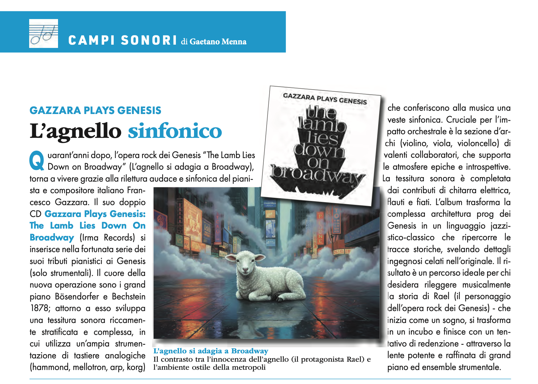 Gazzara plays Genesis successful piano-orchestral tributes Play Me My Song (2013), Here It Comes Again (2020), Foxtrot (2022) and Selling England By The Pound (2023) were appreciated by original Genesis members such as Anthony Phillips and Steve Hackett. Now keyboardist and composer Francesco Gazzara is back with an absolute masterpiece of the legendary band: a double CD tribute to The Lamb Lies Down On Broadway, released by the IRMA Records label as a Limited Edition CD almost 51 years after the original release of the eponymous Genesis concept album.